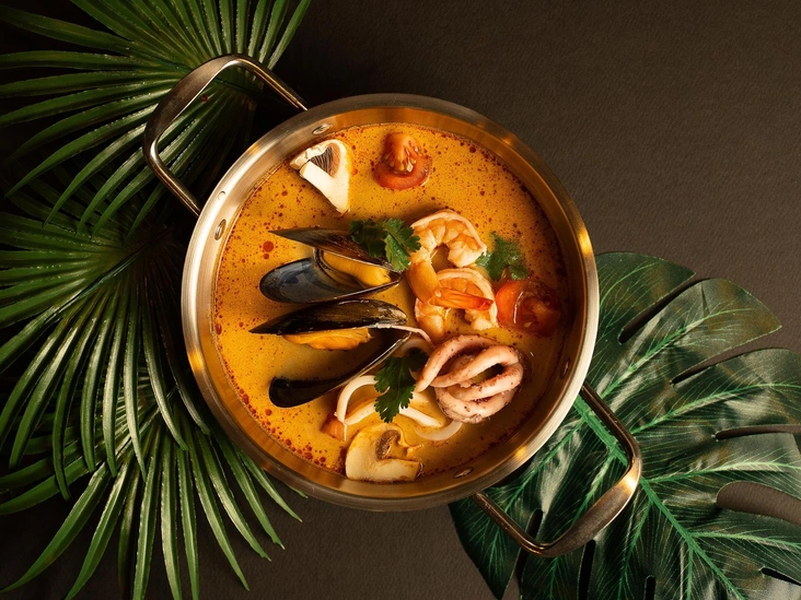 Для десерта подают Mango Sticky Rice, панна-котту с манговым конфитюром и томленые бананы в кокосовом молоке. Барная карта предлагает тайские настойки и авторские коктейли, включая «Тропик Олд Фэшн», «Спайси Негрони» и «Банког Спритц». Интерьер сочетает тайские традиции с современными деталями: натуральное дерево, бамбук, яркие акценты и элементы декора из Таиланда создают ощущение страны улыбок прямо в сердце Москвы.