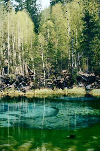 Гейзерово озеро рядом с поселком Акташ стоит посетить хотя бы ради фантастических фотографий. Небольшой термальный водоем, окруженный многометровыми деревьями, имеет необычный окрас: в центре озера с кристально-чистой водой бьют источники, которые формируют затейливые рискунки с бирюзово-имурдуными разводами.