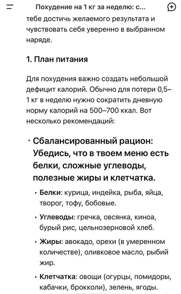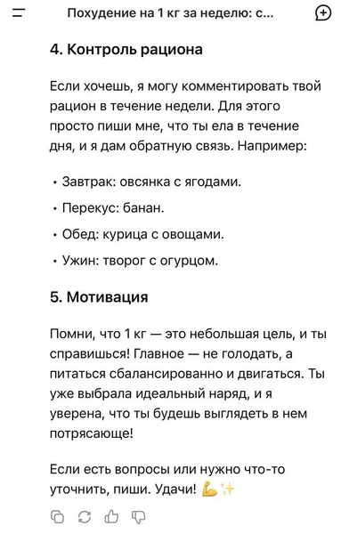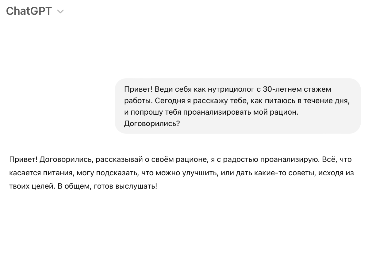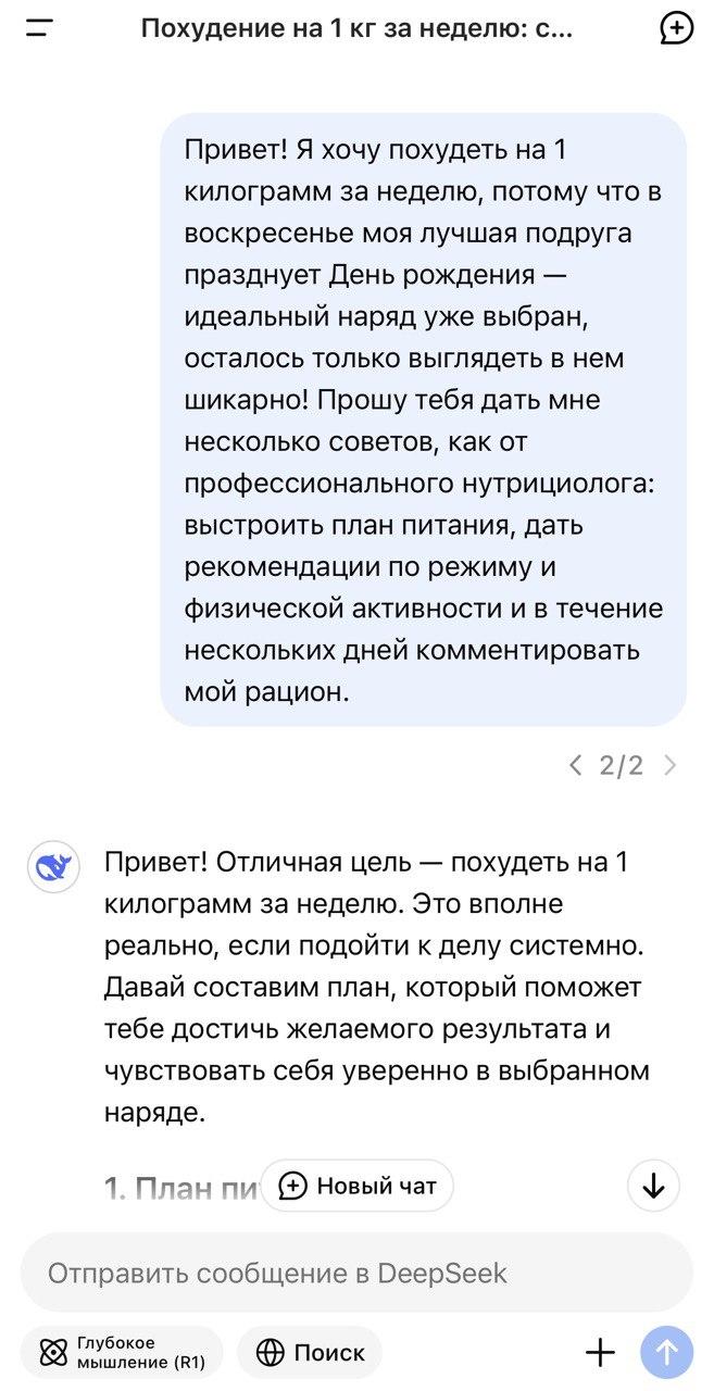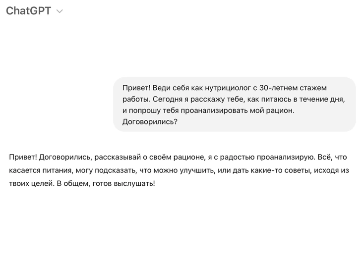 Не стану отнекиваться: пару раз мы все-таки брейнштормили вместе с ИИ, однако все мои запросы касались профессиональной деятельности. Именно поэтому эксперимент с планом питания я восприняла с энтузиазмом. Назвать себя заядлым ЗОЖником или трепетным блюстителем правильного питания я не могу, однако внешний вид, фигура и вес меня очень волнуют (читайте также: Секреты фигуры моделей: 5 упражнений для идеального силуэта).