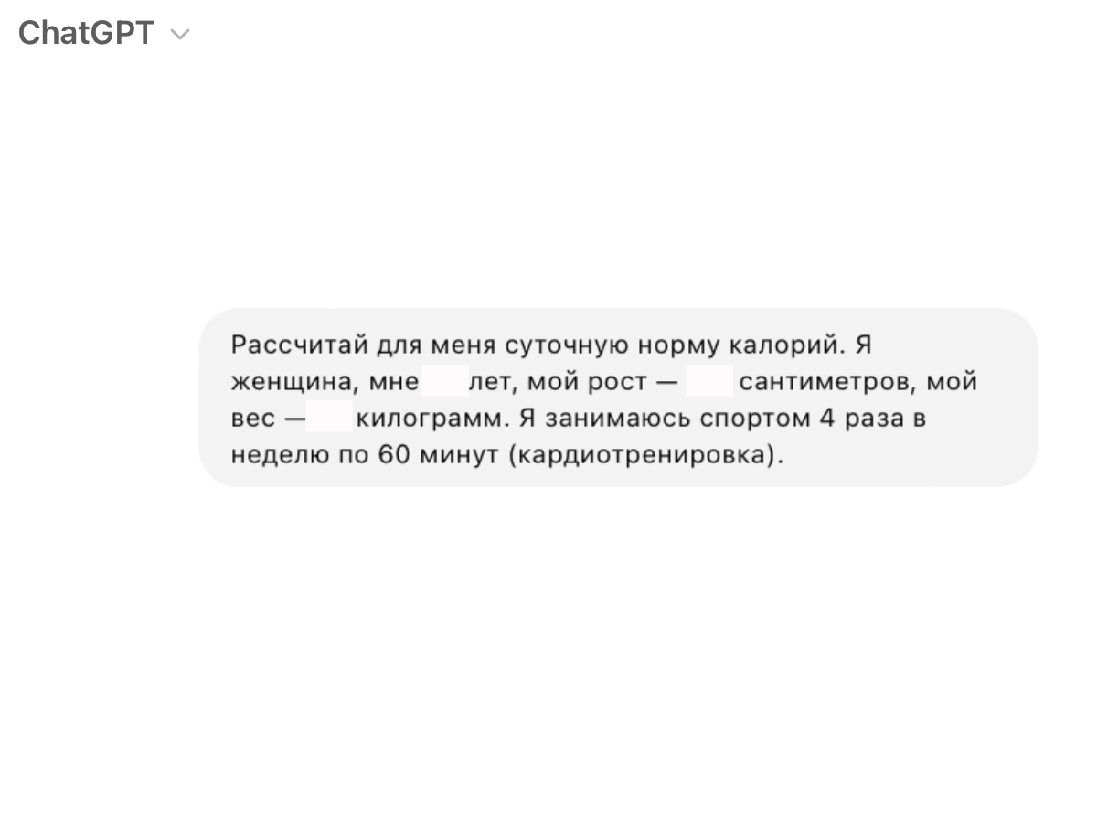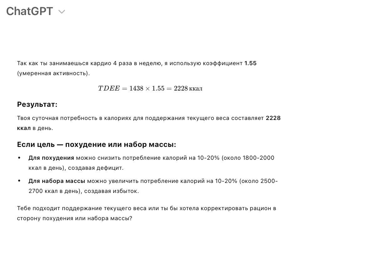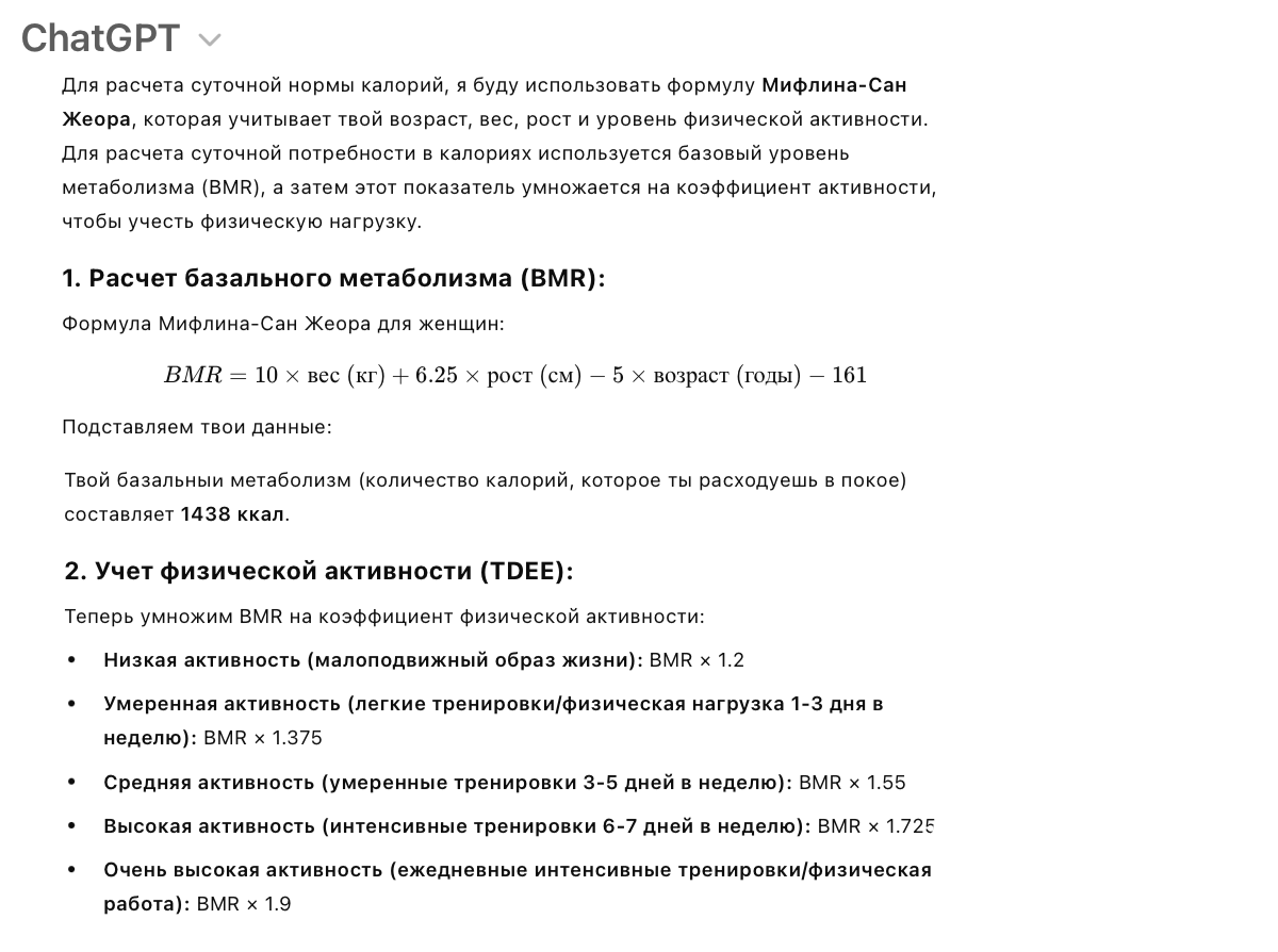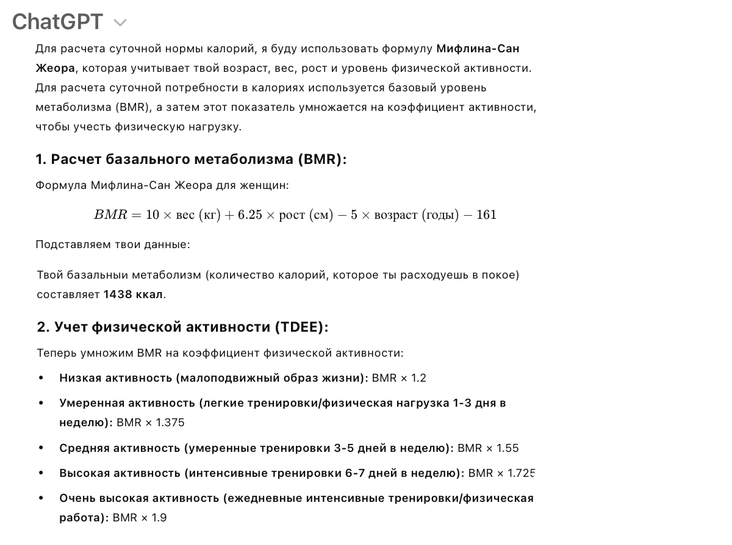 Ну и, наконец, я решила попробовать уже готовые промпты для ChatGPT из интернета, которые вроде бы могут существенно облегчить жизнь людям, следящим за своим питанием. Сначала я попросила искусственный интеллект рассчитать мою суточную норму калорий с учетом персональных параметров и физической активности. С этим, как мне кажется, ChatGPT справился на отлично, подробно объяснив свои расчеты, да еще и предложив варианты корректировки нормы калорий в зависимости от цели — похудения или набора массы.