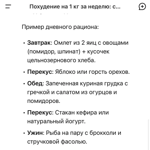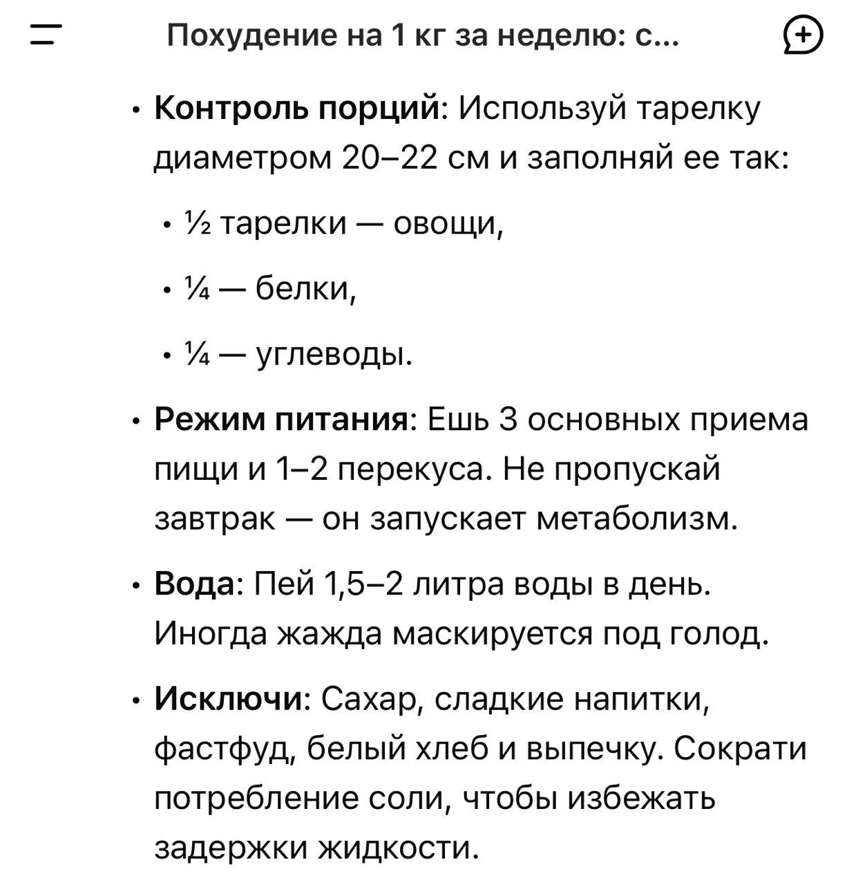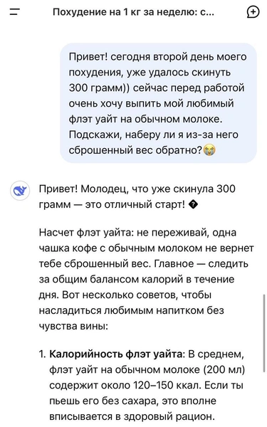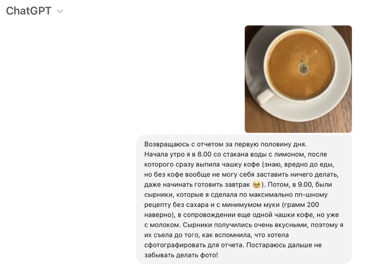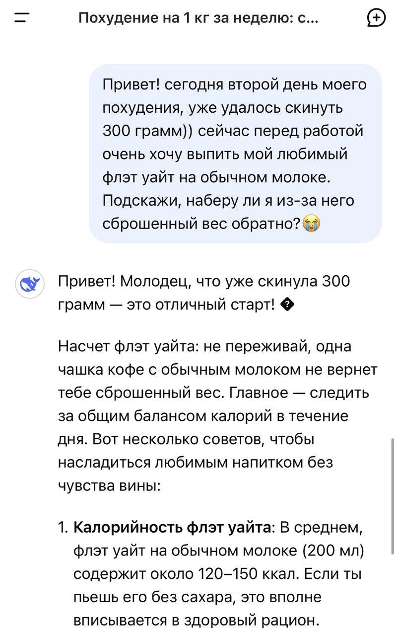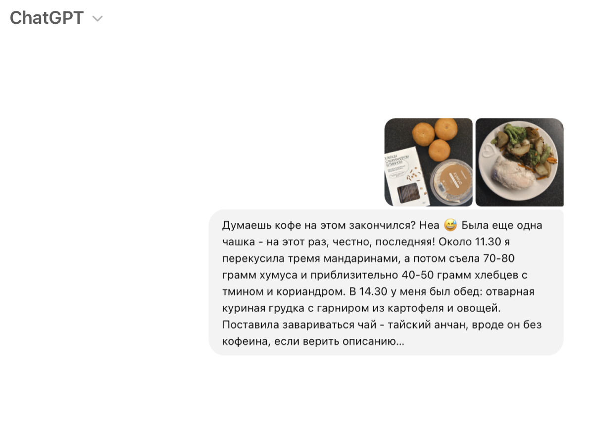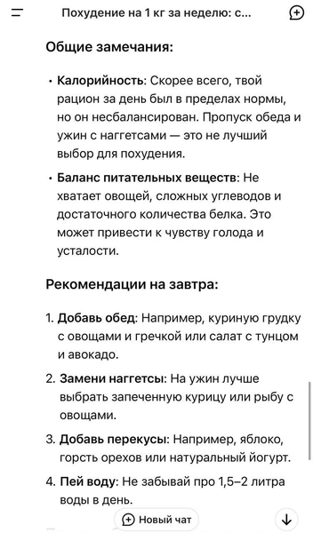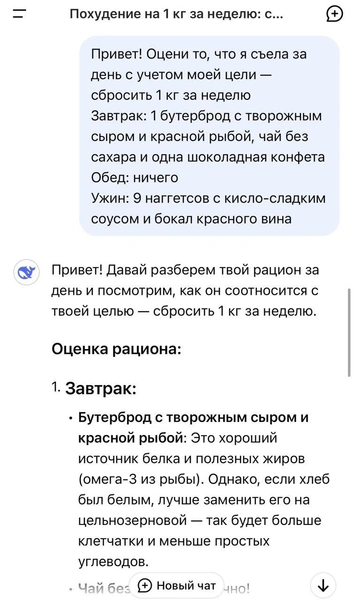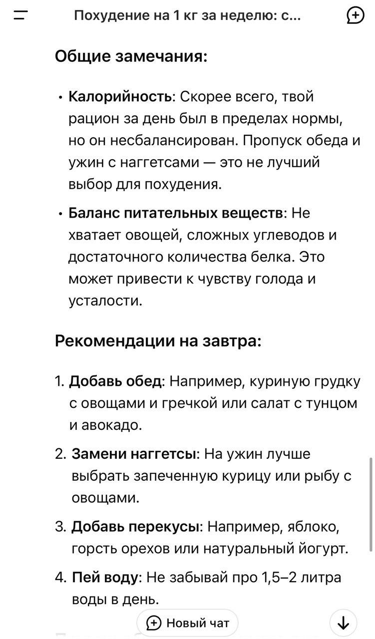 Единственный минус, который я отметила для себя — в чат нельзя скидывать изображения. ИИ не мог оценить то, что находится у меня в тарелке, поэтому приходилось описывать словами. Сразу отмечу, что я не ставила перед ним задачу контролировать меня в течение недели: вес и рацион я, следуя советам, отслеживала самостоятельно.
