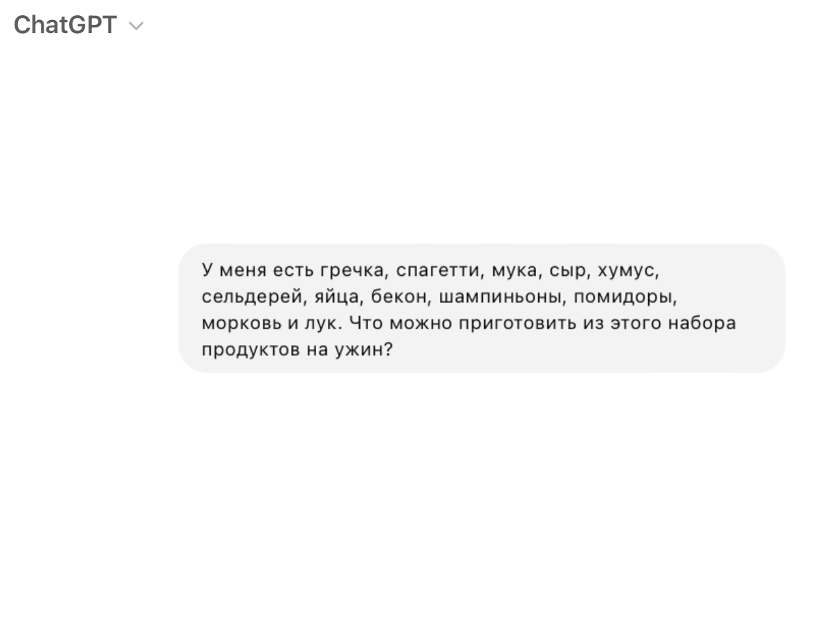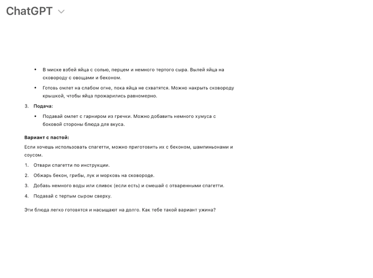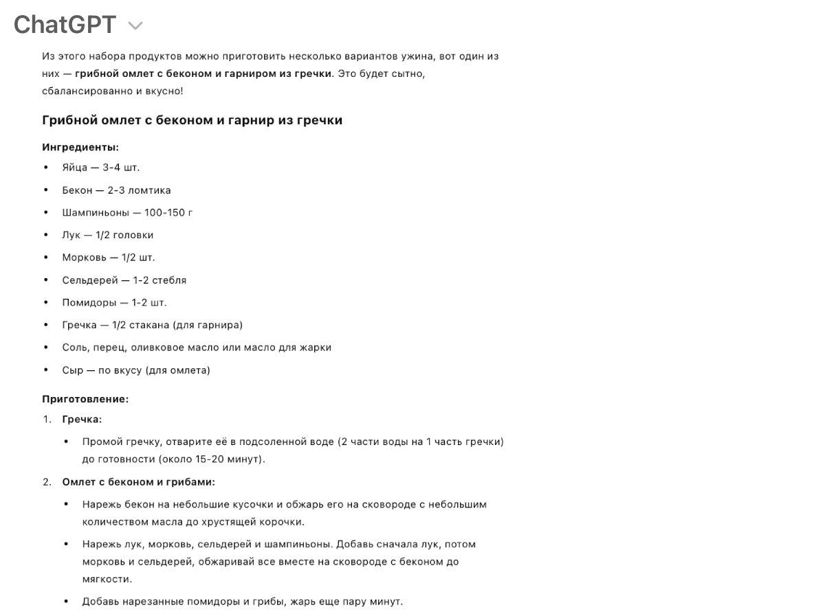 Напоследок я решила запросить у ChatGPT идеи для блюда из случайного набора продуктов. Сошлись на грибном омлете с беконом и гарниром из гречки — вроде звучит неплохо, да? Надо будет попробовать приготовить.