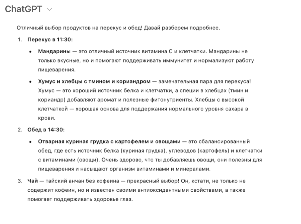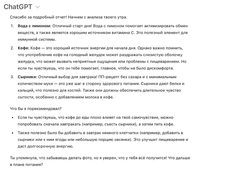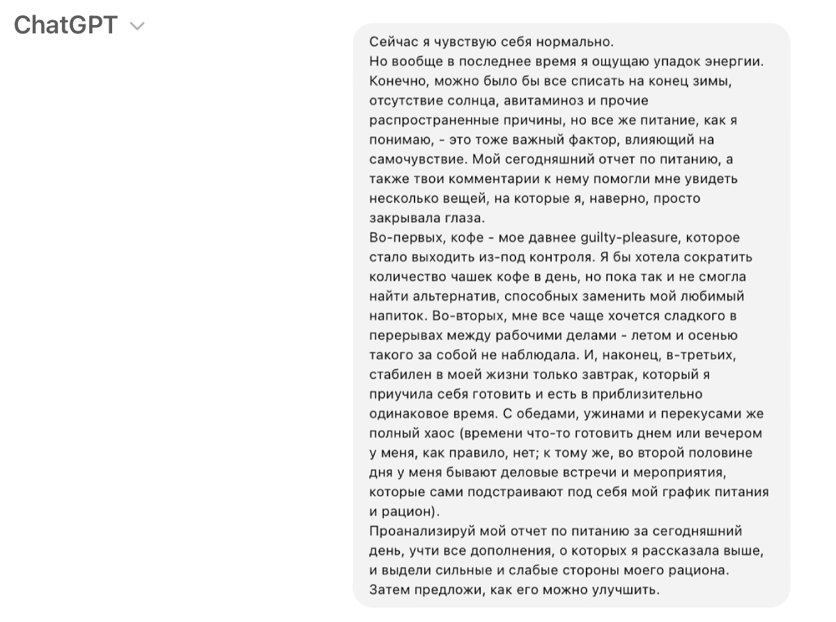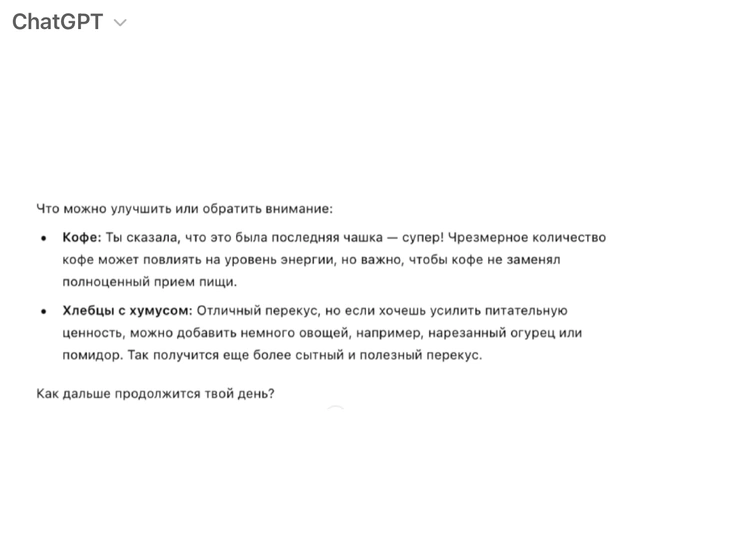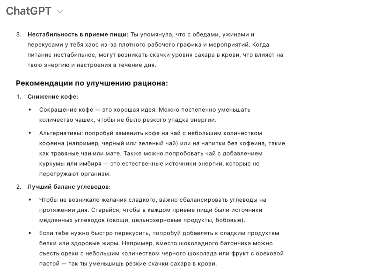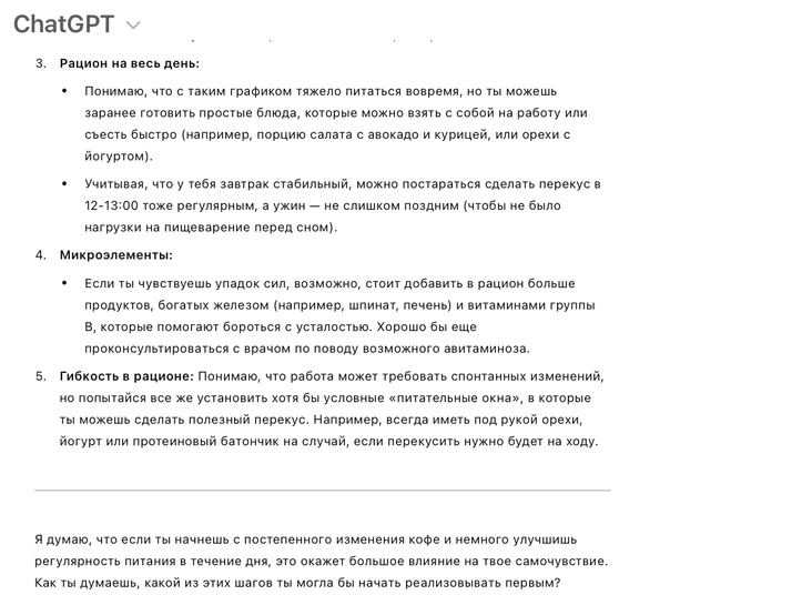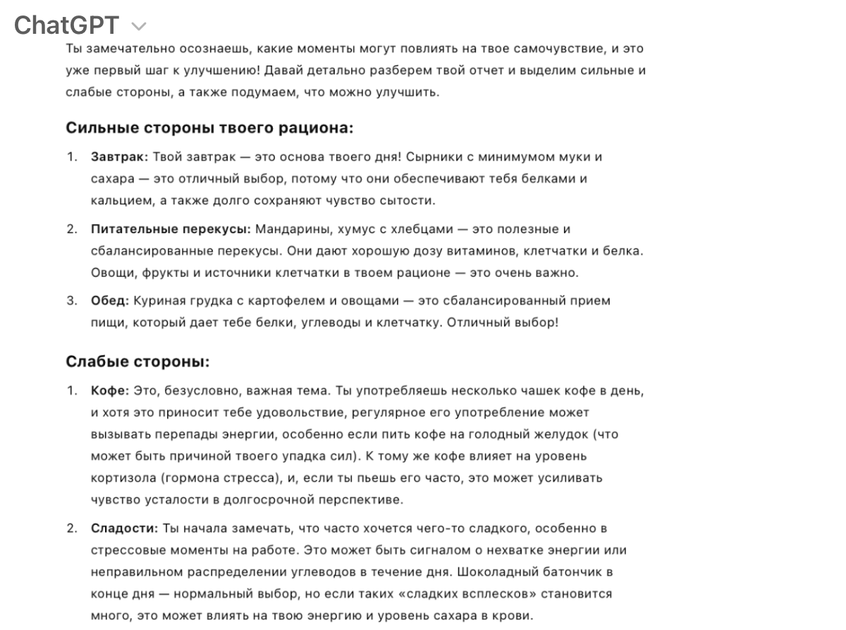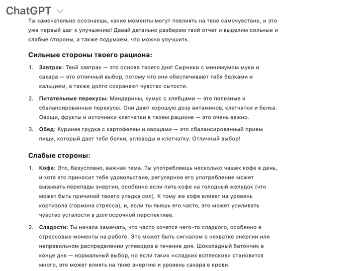 Вдохновленная таким позитивным опытом взаимодействия с ИИ, играющем роль нутрициолога, я решила пойти дальше и попросить у него совета по улучшению питания. И вот тут меня, к сожалению, ждало разочарование. Возможно, у ChatGPT было не так много данных для анализа, но он дал достаточно клишированные советы, а в качестве слабых сторон выделил только те, на которые я сама попросила его обратить внимание. Допускаю и то, что я подсознательно ждала такого же «вау-эффекта» от рекомендаций ИИ, какой испытала от коммуникации с ним в течение дня. А получила лишь сухой список достаточно банальных рекомендаций, пусть даже и разумных с точки зрения нутрициологии (так это или нет — узнаем чуть позже у реального нутрициолога).