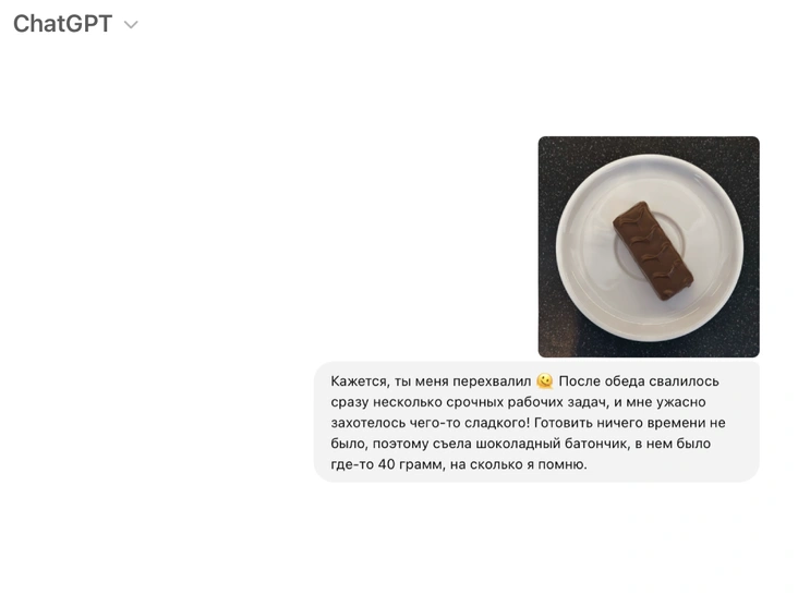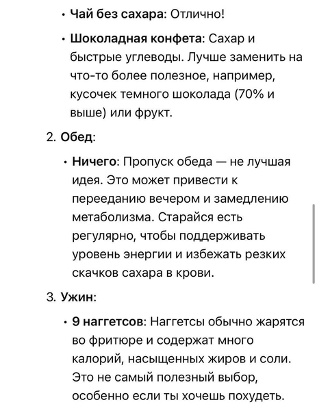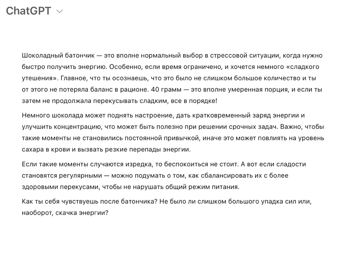 И хотя ИИ очень поддерживает и хвалит за правильный подход, меня это смущает. Что бы вы ни съели — все хорошо! И пасту можно, ведь она такая аппетитная. И батончик — это нормально в стрессовой ситуации. И отварная курица с овощами и картофелем — это сбалансированный рацион, хотя сбалансированный рацион гораздо сложнее и многокомпанентнее.