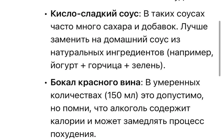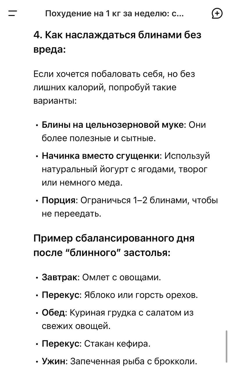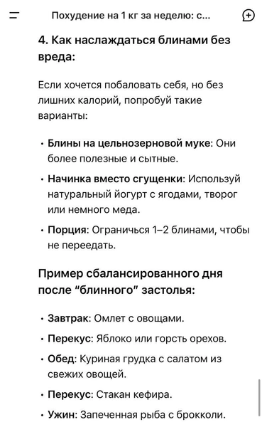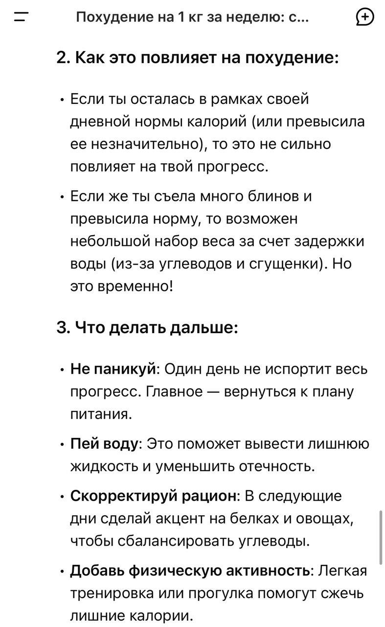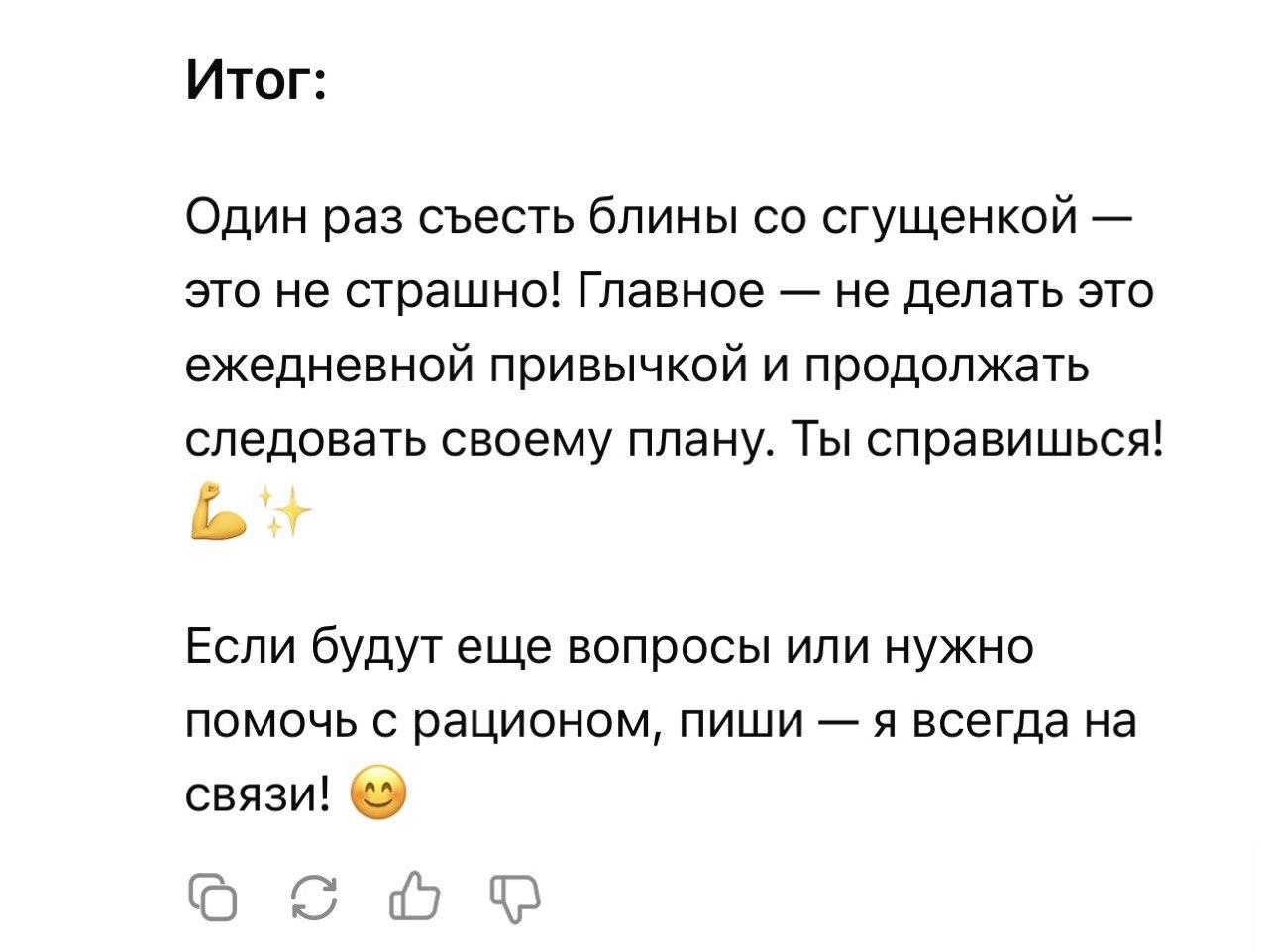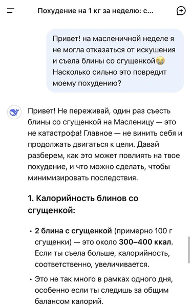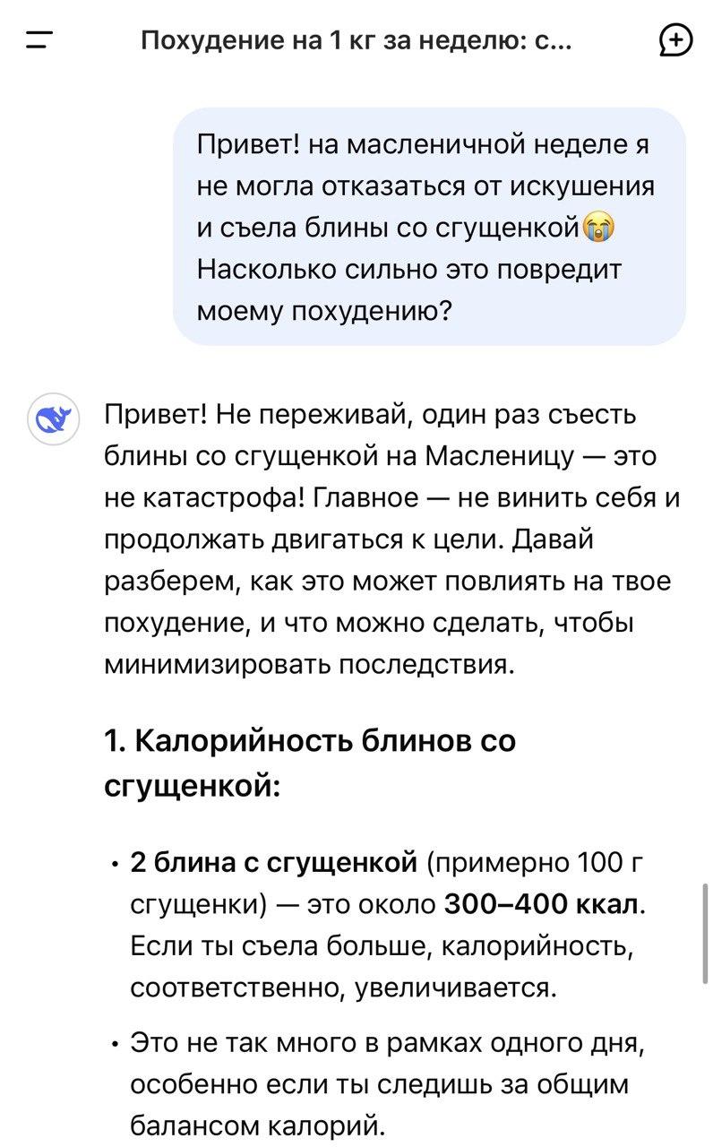 Признаюсь, испытывать терпение моего виртуального диетолога мне пришлось неединожды. Что поделать, хочется и в платье влезть, и блины на Масленицу съесть! Но ИИ оказался очень милым и довольно рассудительным: не уставал поддерживать меня, совсем не ругал и четко расписывал, где именно я «согрешила», а, главное, как теперь искупить содеянное.