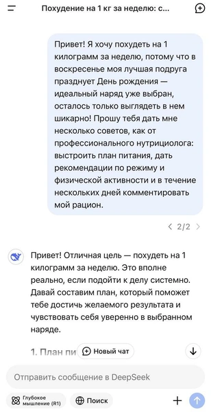 Хотя четкий подсчет каллорий и постоянное отслеживание питание — все-таки не моя история, недельный эксперимент явно удался. Благодаря советам ИИ я достигла своей цели: возможно, дело в том, что сама по себе неделя выдалась довольно активная, а, может быть, мы, и правда, нашли идеального нутрициолога? Для того, чтобы оценить правильность советов, данных мне DeepSeek, я обратилась к профессиональному нутрициологу.