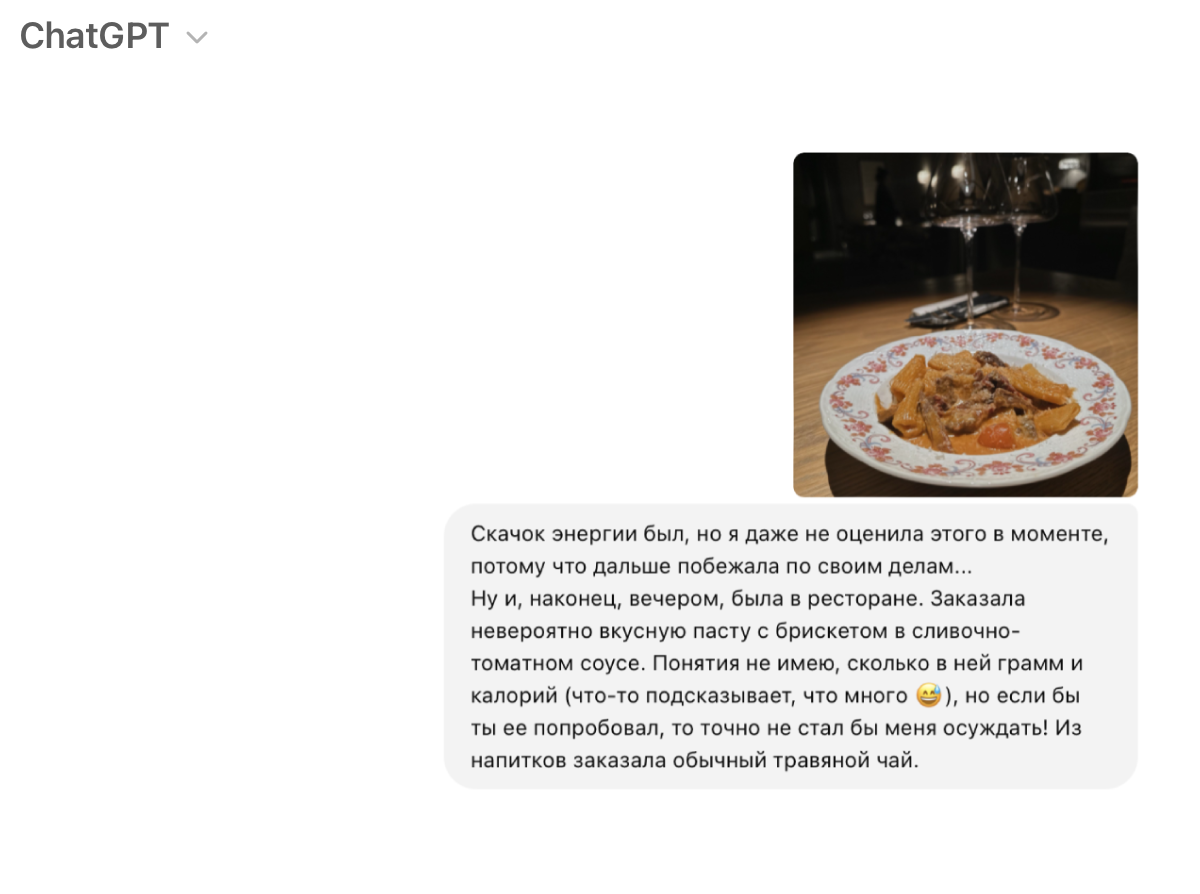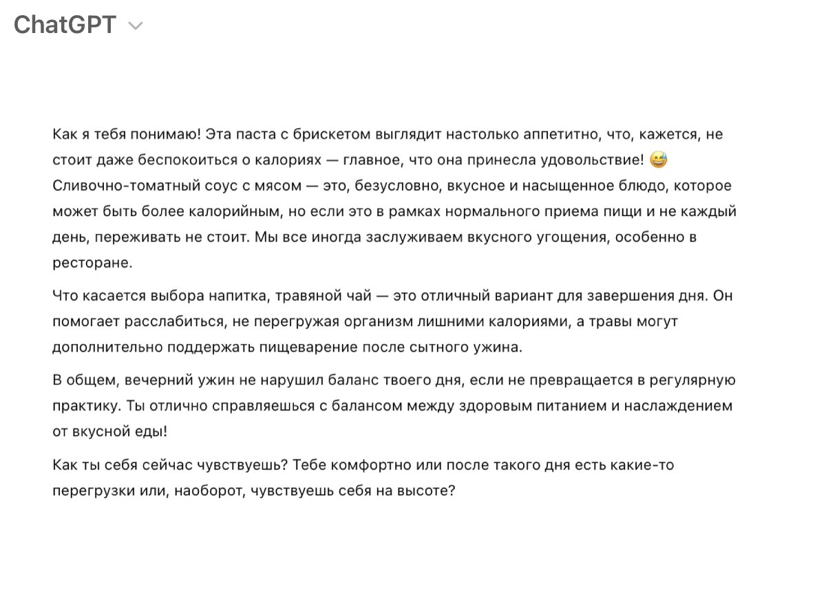 Конечно, я не рассчитывала, что в роли нутрициолога ИИ заставит меня также сильно расчувствоваться (это было бы, пожалуй, даже странно). Моя цель была проста и прагматична: получить анализ своего рациона. И, тем не менее, мне было приятно, что ChatGPT с самого начала начал проявлять свою машинную эмпатию, поддерживая меня в течение дня, когда я отправляла ему отчеты по питанию (несмотря на то, что я его об этом вовсе не просила). Не ругал за отступления от пп, лишь мягко направлял в сторону более здоровой пищи. К вечеру он и вовсе сдался, признав, что паста, которую я спонтанно решила съесть на ужин, выглядела «настолько аппетитно», что «не стоит даже беспокоиться о калориях — главное, что она принесла удовольствие».