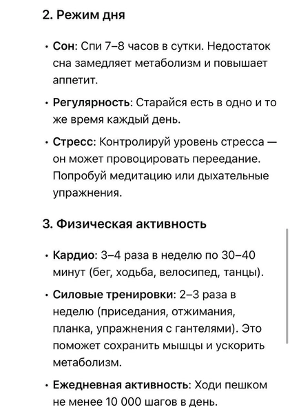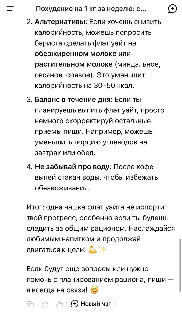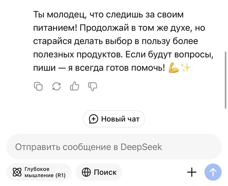 Как видите, DeepSeek не только дал довольно четкие рекомендации по питанию и режиму дня, но и не забыл предложить свою помощь и дать заряд мотивации. Признаюсь, вести с ним диалог было очень приятно и экологично. На протяжении первых дней я старалась строго придерживаться его советов, однако рабочие будни — явление неоднозначное: обязательно поддашься искушению в виде кофе.