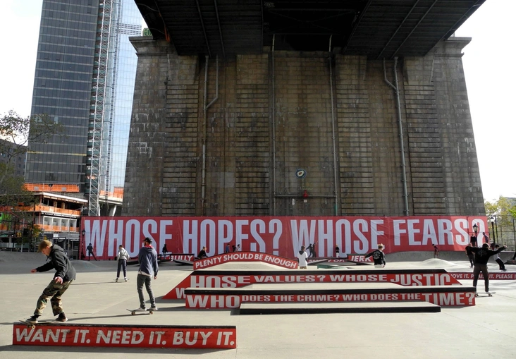 Самый яркий пример паблик-арта, который позволил молодому поколению одновременно «включиться» и задуматься о вечном, — проект «Без названия (Скейт)», созданный одной из ключевых фигур феминистского искусства, художницей Барбарой Крюгер.