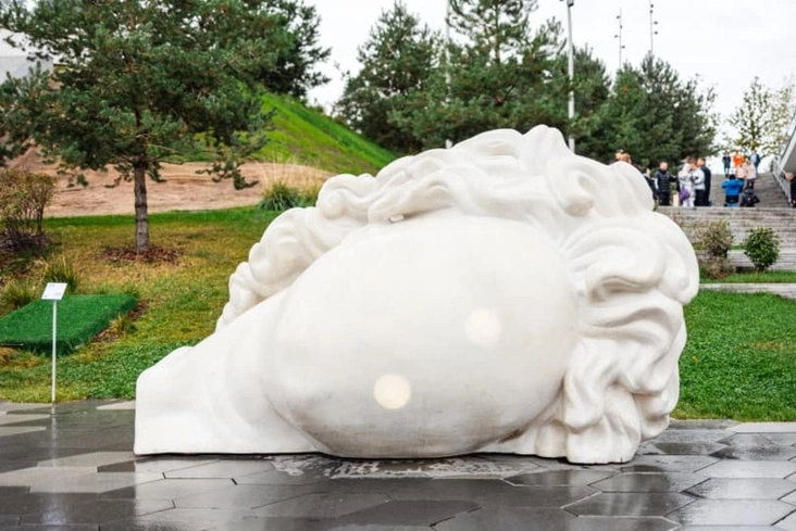 Мы не могли не вспомнить о «Большой античной голове» авторства Аристарха Чернышева. Объект паблик-арта представляет собой парафраз скульптурной головы Александра Македонского, у которого вместо лица — анимированный знак «загрузки» изображения. В рамках проекта «В Москве, о Москве, для Москвы» «голова» была выставлена перед спуском к Подземному музею в парке «Зарядье». Скульптура призывает задуматься о судьбе монументов, устанавливаемых сегодня: насколько они уместны и что их ждет в будущем? Сейчас арт-объект желающие могут наблюдать в подмосковном парке Малевича.