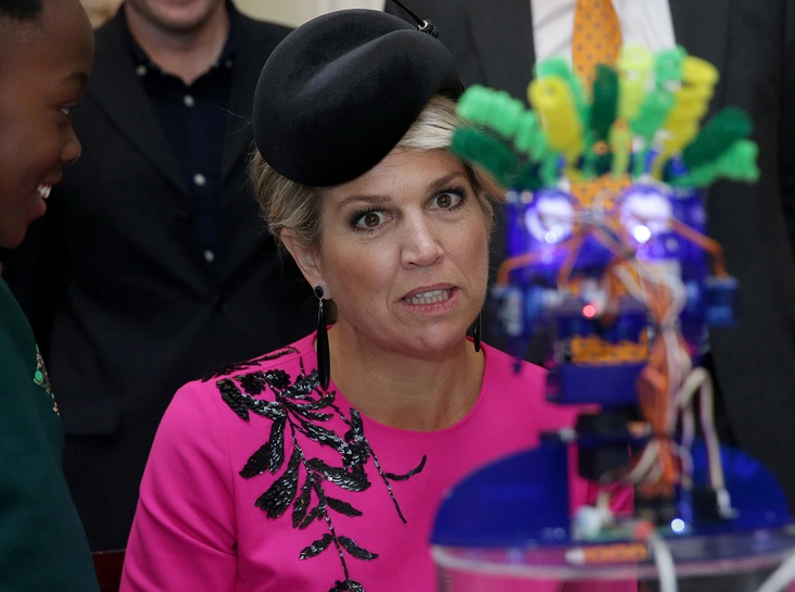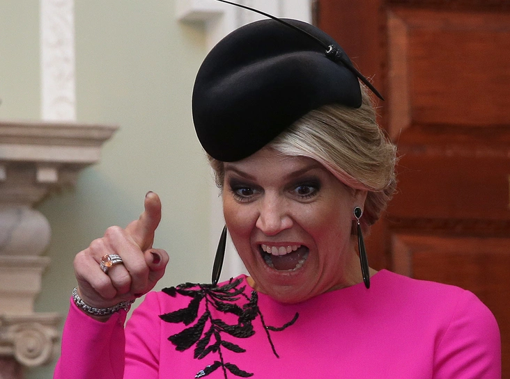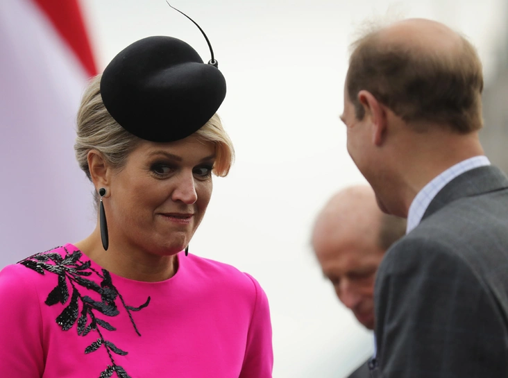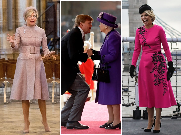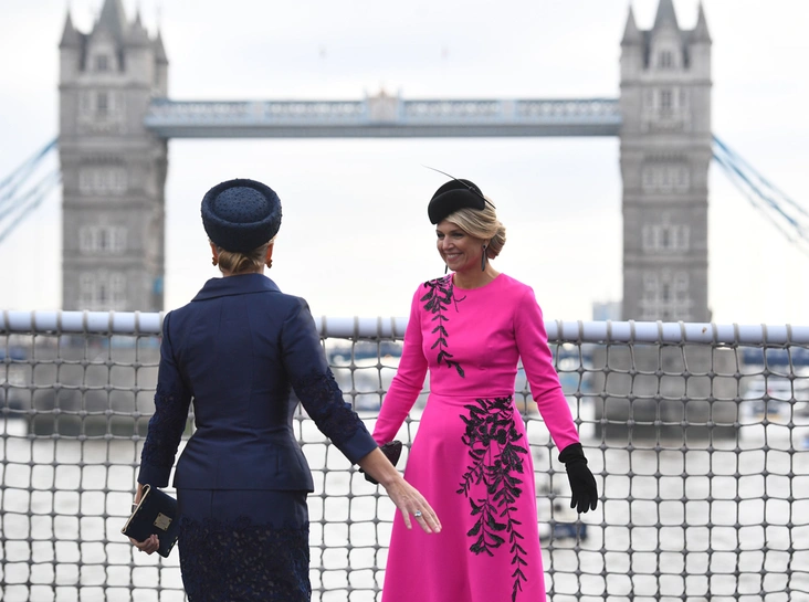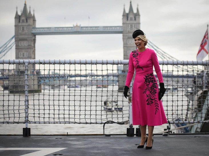 Питающая страсть к ярким краскам, королева Максима в первый день мероприятий почти растворилась в нюдовой гамме (платье-пальто предположительно от Claes Iversen с широким поясом и необработанными швами, лодочки на среднем каблуке, фасинтор), но во второй ─ последовала велению души, облачившись в платье цвета фуксии. Привычно улыбчивая и жизнерадостная Максима была звездой и практически центральным элементом любой картинки, общий фон которой составляли сдержанные чопорные англичане. Расскажем подробнее, чем запомнится дебютное посещение нидерландскими монархами Лондона.