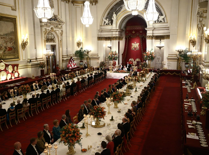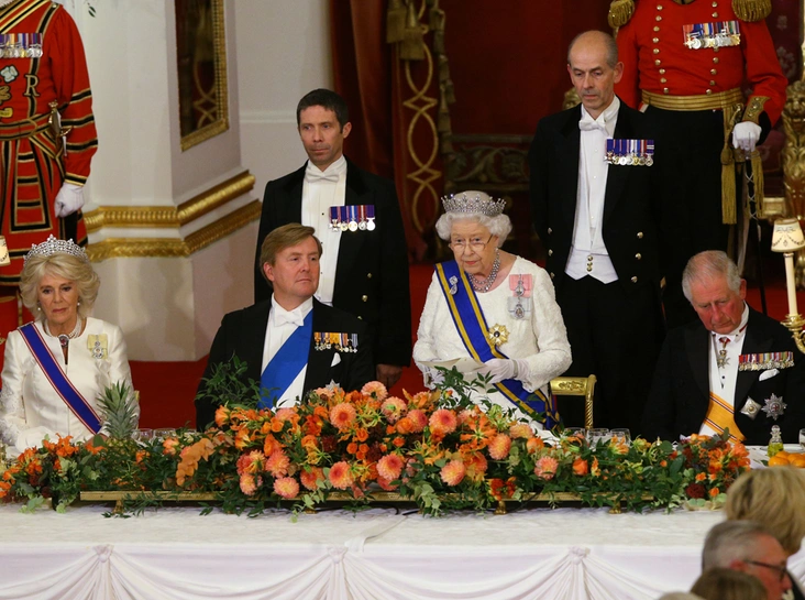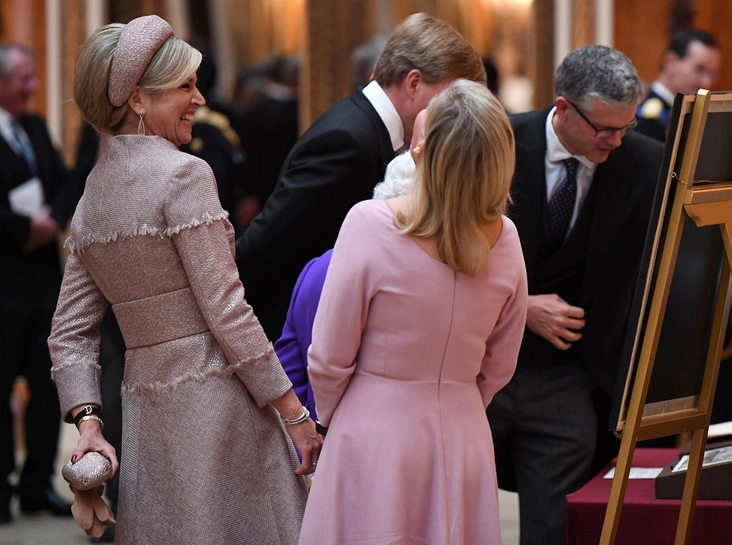 Государственный банкет собрал очень высокопоставленных особ (всего на торжественный ужин было приглашено 150 человек). В их числе оказались премьер-министр Великобритании Тереза Мэй, министр иностранных дел Нидерландов Стеф Блок, принцесса Майкл Кентская, архиепископ Кентерберийский и принцесса Мейбл, вдова Йохана Фризо, брата голландского короля, погибшего 5 лет назад во время катания на горных лыжах. В соответствии с дресс-кодом white tie («белый галстук»), женщины в этот вечер блистали в бальных костюмах и тиарах (подробная ретроспектива ─ «Парад тиар в Букингемском дворце»).