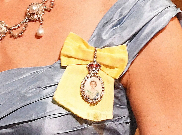 Кэтрин появилась на приеме с королевским семейным орденом. Он представляет из себя миниатюрный портрет, изображающий Королеву, заключен в стеклянную оболочку, которая украшена копией королевской короны святого Эдуарда из красной эмали и бриллиантов. Орден был прикреплен к желтой ленте и располагался на левом плече. Герцогиня Кембриджская нечасто надевает этот знак отличия (его дарует действующий монарх членам королевской семьи женского пола как знак особого расположения и даже поощрения), хотя, по данным королевских обозревателей, получила его еще в декабре 2017 года.