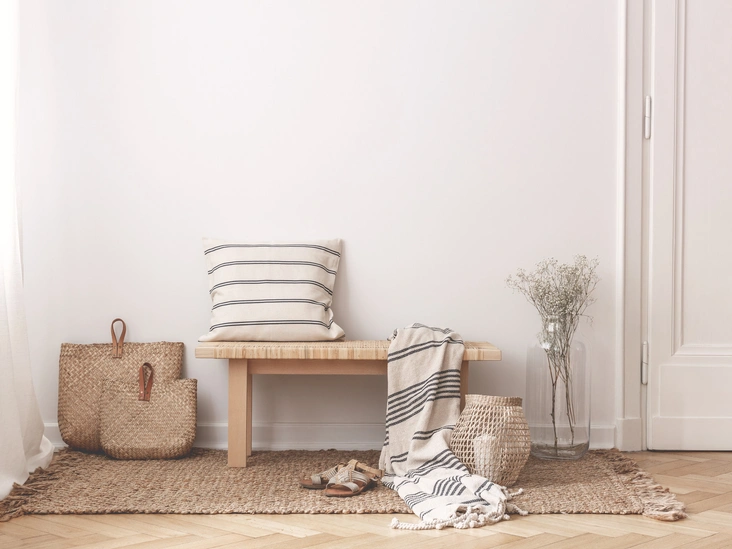 Оформить скамью можно при помощи декоративных подушек или пледа — это позволит создать атмосферу уюта при входе в квартиру.