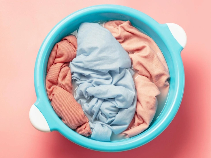 Опустите вещи в таз и аккуратно распределите их внутри руками, одновременно вспенивая воду с моющим средством. Оставьте одежду в растворе на 15-30 минут, не больше.