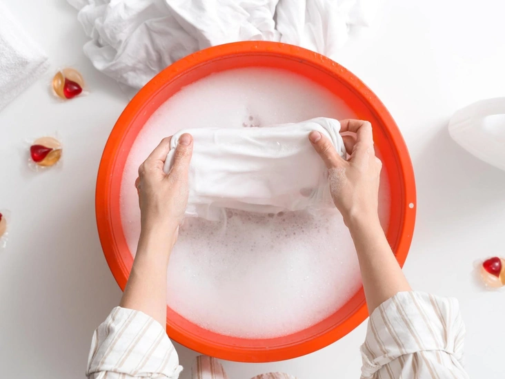 Опустите вещи в таз и аккуратно распределите их внутри руками, одновременно вспенивая воду с моющим средством. Оставьте одежду в растворе на 15-30 минут, не больше.