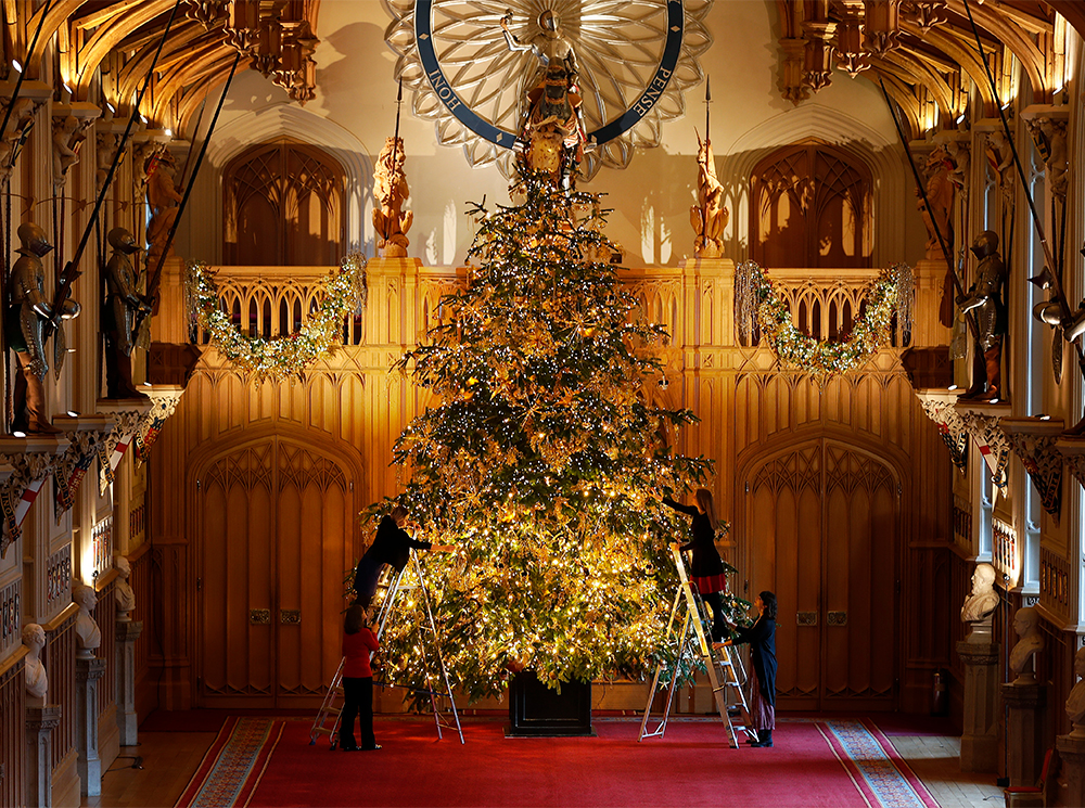 Центральное место праздников в Виндзоре – Холл святого Георгия, самый большой зал старинного замка. Здесь высится, поблескивая украшениями, рождественская елка высотой около 7 метров. Процесс декорирования праздничного дерева каждый год занимает около 13 часов, и в качестве украшений используются сотни игрушек, гирлянд и мишуры – в этом году на елке горят 7 тысяч лампочек. И хотя традиционно Королева проводит Рождество в Сандрингеме, Ее Величество в обязательном порядке каждый год проводит инспекцию рождественского дизайна Виндзора.