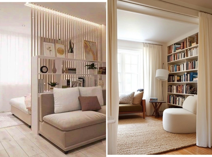 Используйте мобильные перегородки, стеллажи, тканевые занавески для разделения зон. Мебель также может стать эффектным инструментом для разделения пространства.