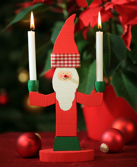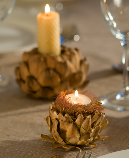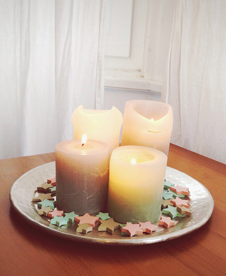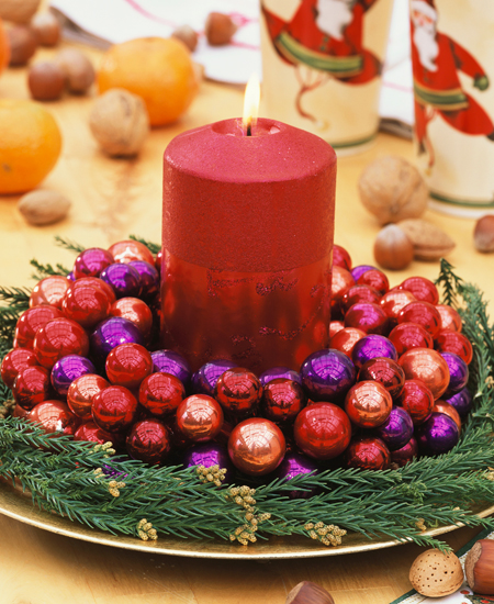По традиции в центр стола ставится главное горячее блюдо – запеченное мясо, курица, индейку и т.д. Этот вариант подходит, когда все блюда подаются одновременно. Если предполагается, что они будут выноситься к столу постепенно, на время подачи салатов и холодных закусок, установите по центру вазу с еловыми ветками. Подойдет также композиция из свечей разной высоты. Ее очень просто сделать своими руками: составьте свечи на широкое блюдо или поднос, а вниз уложите еловые ветки и позолоченные шишки. Толстые белые свечи можно обвязать веревочками или лентами.