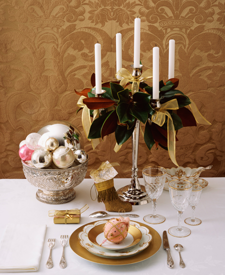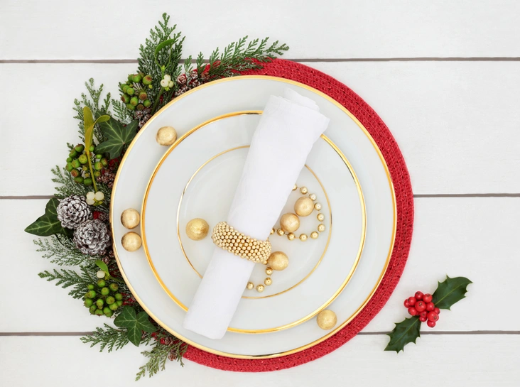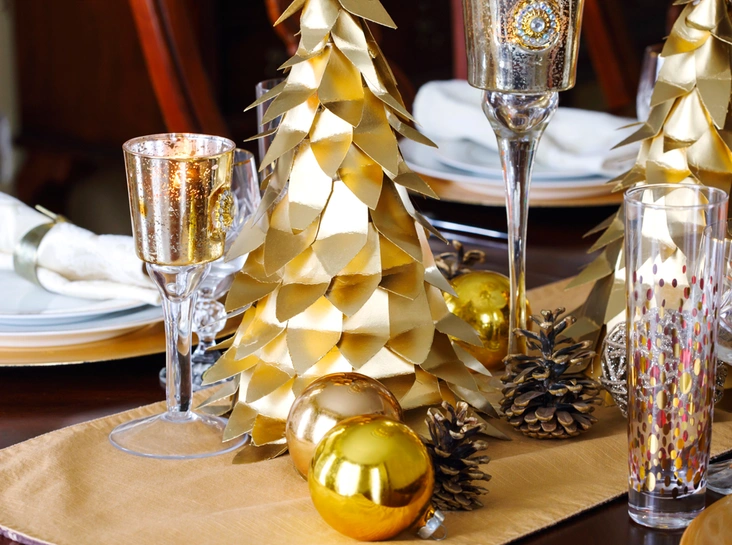 Золотой может быть использован в акцентах среди белой посуды и текстиля. Особенно изысканно он смотрится в сочетании с темной медью. Хочется яркости и не хочется тратить время на подбор сочетаний? Оба главных цвета года – красный и золото – отлично сочетаются между собой. Не переборщите: лучше использовать в сервировке не более двух-трех цветов.