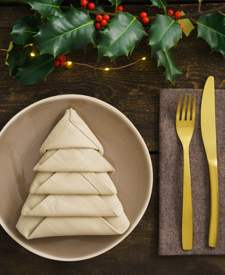 Старайтесь, чтобы хоть часть стола была сервирована деревянными предметами: декоративные доски, блюда, чашки, ложки. Хорошо впишутся в новогодний декор-2019 плетеные корзинки. Если вы решите до конца придерживаться «природного» стиля, можно усадить гостей за деревянный стол без скатерти, но разложить персональные холщовые салфетки и симпатичную тканевую дорожку посередине.