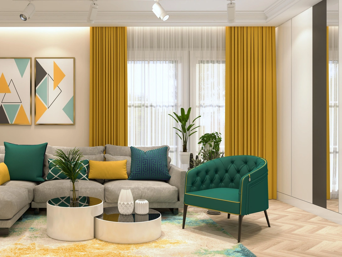 Вы можете не просто подобрать цветовую гамму под эти элементы, выбрав единый оттенок, но и создать целую цветовую палитру, перетекающую из одного предмета декора в другой. Так, шторы насыщенного зеленого оттенка будут чудесно сочетаться с декоративными подушками от темно-синего, шоколадного до зеленого и салатового тонов и также подходить к синему или бирюзовому ковру.