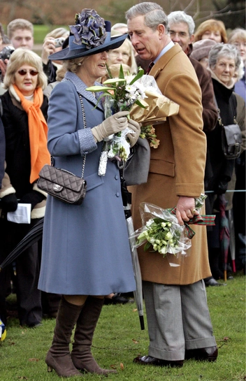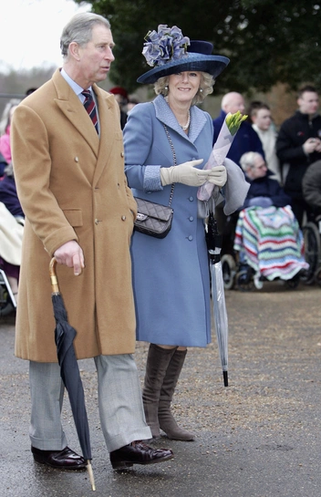 В свое первое Рождество в качестве жены принца Уэльского Камилла предстала перед публикой в нежно-васильком ансамбле из пальто и шляпы с крупным цветком, дополнив их белыми перчатками, серыми замшевыми сапогами и сумкой Chanel. Пара долго переживала, что общественность не поддержит их брак, но королевские поклонники держали в руках огромный плакат с британским флагом и надписью «С Рождеством, Камилла». Из толпы Камилле также вручили несколько букетов.