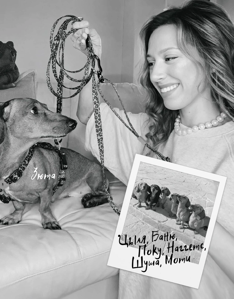 У нас семь такс и один ризеншнауцер. Начнем с Зюты — это мама нашего дома и предводитель семейства. Очень любит всех строить. Ей уже 10 лет, но она сохранила дух щеночка. Самая активная, игручая. Дальше ее дети: Цыля от первого помета (полное имя Цветочек, 7 лет) — семейно-ориентированный, заботливый, фотогеничный актер, постоянно снимается у моего мужа в скетчах. Баню — гладкошерстный черный мальчик, сдержанный и верный, джентльмен. Поку — рубаха-парень. Моти (Матильда) — мягкая флиртушка-девочка. Наггетс, или Нанита, — это чисто аниме-собака, невероятно миловидная и всегда немного расстроенная, королева драмы, ее нужно обязательно жалеть 24/7. Им всем вместе по 5 лет.