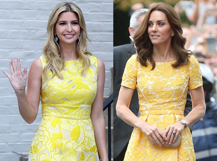 Похоже, желтые кружевные платья-миди всерьез рискуют стать фаворитами сезона, ведь в одну неделю их успели продемонстрировать сразу две самые стильные женщины планеты: Первая дочь США Иванка Трамп и герцогиня Кембриджская Кэтрин. Последней, правда, повезло меньше, так как она выгуляла свой наряд от британского дизайнера Jenny Packham двумя днями позднее – за что и «получила» от самых внимательных fashionista по всему миру. Точнее досталось, конечно, не самой Кэтрин, а ее стилисту Наташе Арчер, ответственной за аутфиты герцогини во время королевского тура.