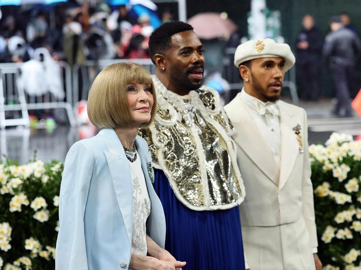 Анна Винтур появилась на темно-синей дорожке одной из первых — и под руку с двумя джентльменами: Коулом Доминго и Льюисом Хэмильтоном. Оба, к слову, вошли в «великолепную пятерку» председателей бала: помимо них в состав входят A$AP Rocky, Фаррелл Уильямс и Леброн Джеймс. Последнему, к сожалению, пришлось пропустить мероприятие — баскетболист сильно заболел прямо накануне Бала.