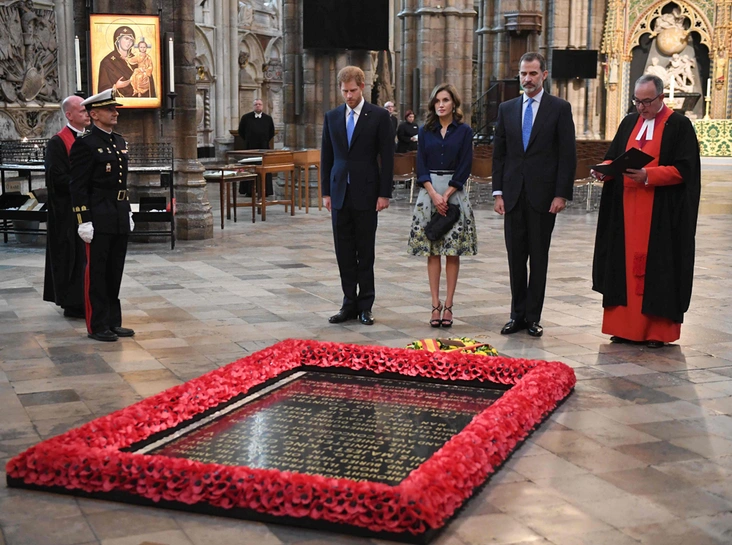 На следующий день король Фелипе с утра пораньше отправился на бизнес-форум, посвященный развитию торговых отношений между Испаний и Великобританией. Однако супругу свою не взял: королева Летиция присоединилась к мужу уже после полудня во время торжественного посещения Вестминстерского аббатства. Проводить испанских монархов в старейшую готическую церковь Англии был, к слову, призван принц Гарри, для которого – как и для Летиции – это первый опыт участия в государственных визитах.