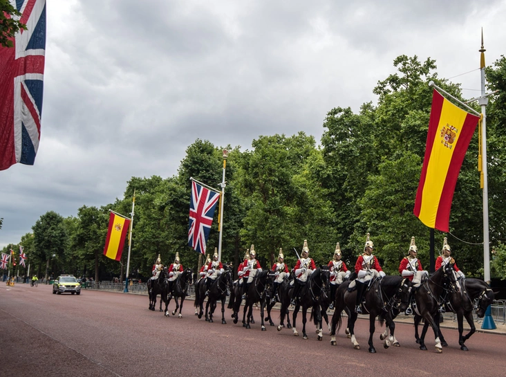 В 11.40 по лондонскому времени по главной улице Лондоне Мэлл прошел торжественный парад королевской гвардии. Сама Елизавета прибыла на Плац первой ─ ровно в полдень. Для приветствия испанских монархов Королева подобрала наряд цвета орхидеи и автомобиль в тон – вишневый Rolls-Royce.