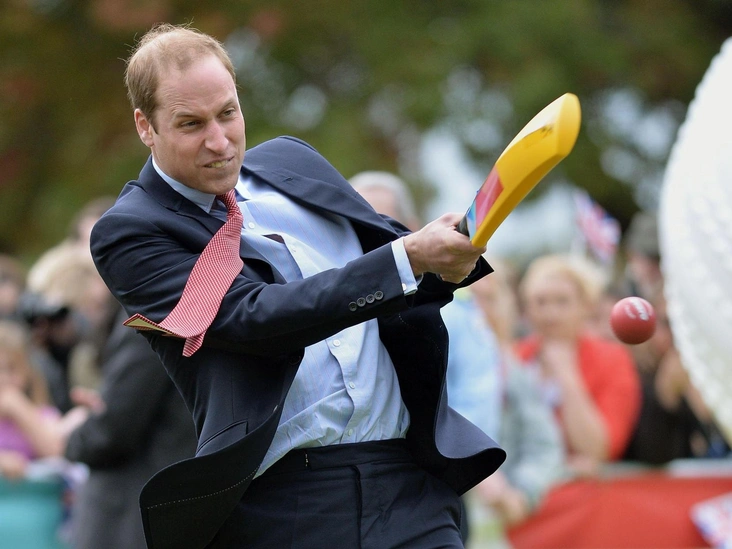 Эта странная фотография сделана в восьмой день королевского тура по Австралии и Новой Зеландии в 2014 году. Напряжение не могло быть выше, чем когда Уильям, одетый в костюм и рубашку с галстуком, сделал этот удар.