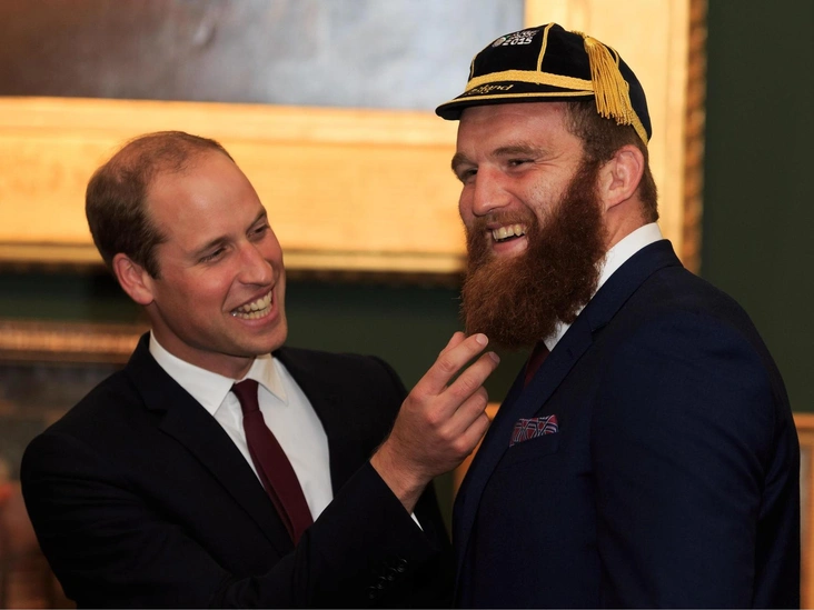 А здесь наблюдается обратная ситуация: герцог Кембриджский смеется во время приветственной церемонии в Ратуше Лондона, когда он инспектирует бороду Джейка Болла из Уэльса.