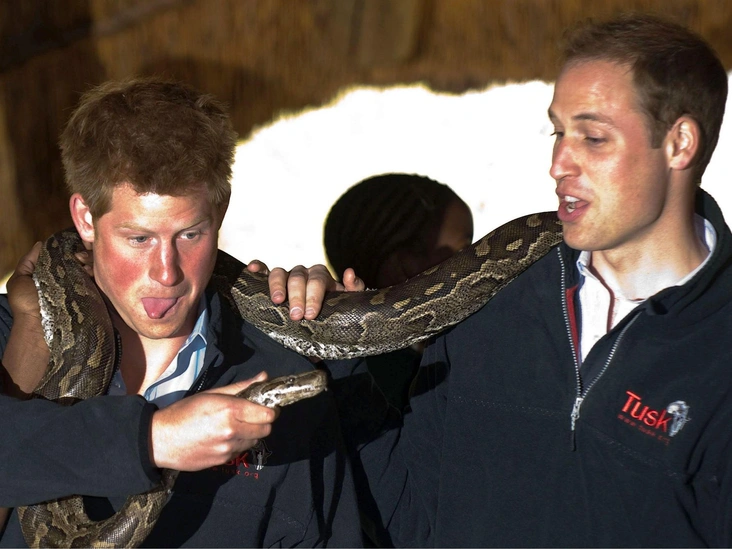 Раньше компаньоном Уильяма по забавным выходкам был и его младший брат. На этом снимке Их Высочества позируют с африканским скальным питоном во время посещения образовательного центра Моколоди в Габороне, Ботсвана. И, кажется, Гарри угрожает старшему брату змеей.
