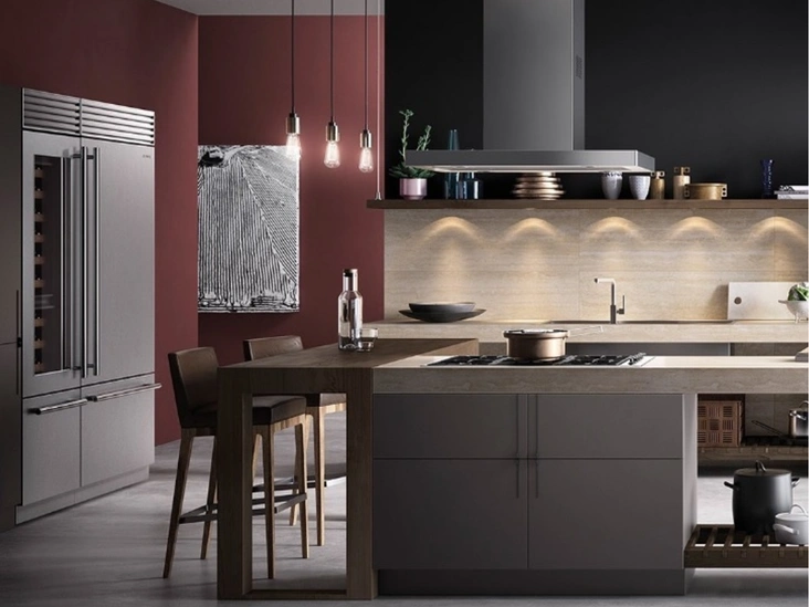 В последние годы в кухонные тренды возвращаются деревянные столешницы. Этот фактурный материал выглядит очень эстетично, гармонично сочетается с матовыми поверхностями благородных оттенков и создает ощущение тепла. Древесина также удобна в эксплуатации. При грамотном уходе и периодической реставрации такая столешница прослужит вам долго.