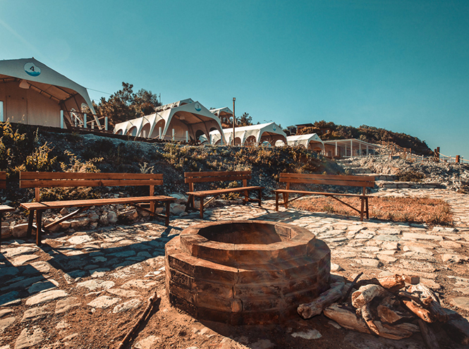 Еще один кемпинг для любителей комфорта, да еще и на самом берегу Черного моря, расположен на мысе Дооб в поселке Кабардинка. В есть места для палаток, уже готовые установленные палатки, а с недавних пор еще и кемперы – симпатичные дома на колесах со всеми удобствами и диванами в цветочек. Но конек этого места – шатры-сафари с видом на море и собственными террасами. Если вы мечтали засыпать и просыпаться под звуки волн, то шатры – неплохой выбор.