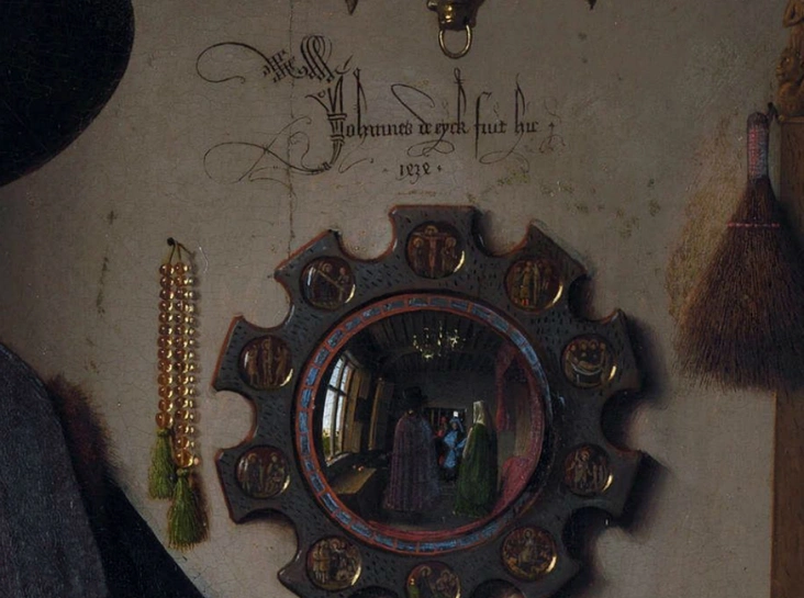 В телепроекте Me, My Selfie and I («Я и мое селфи») канала BBC Four художник-концептуалист Райан Гандер высказал предположение, что прототип селфи появился в Европе еще в пятнадцатом веке. В частности, на знаменитой картине нидерландского живописца Яна ван Эйка Портрет четы Арнольфини (1434 год) можно заметить не только изображение самого художника в зеркале на стене, но и витиеватую надпись на латыни «Здесь был Ян ван Эйк».