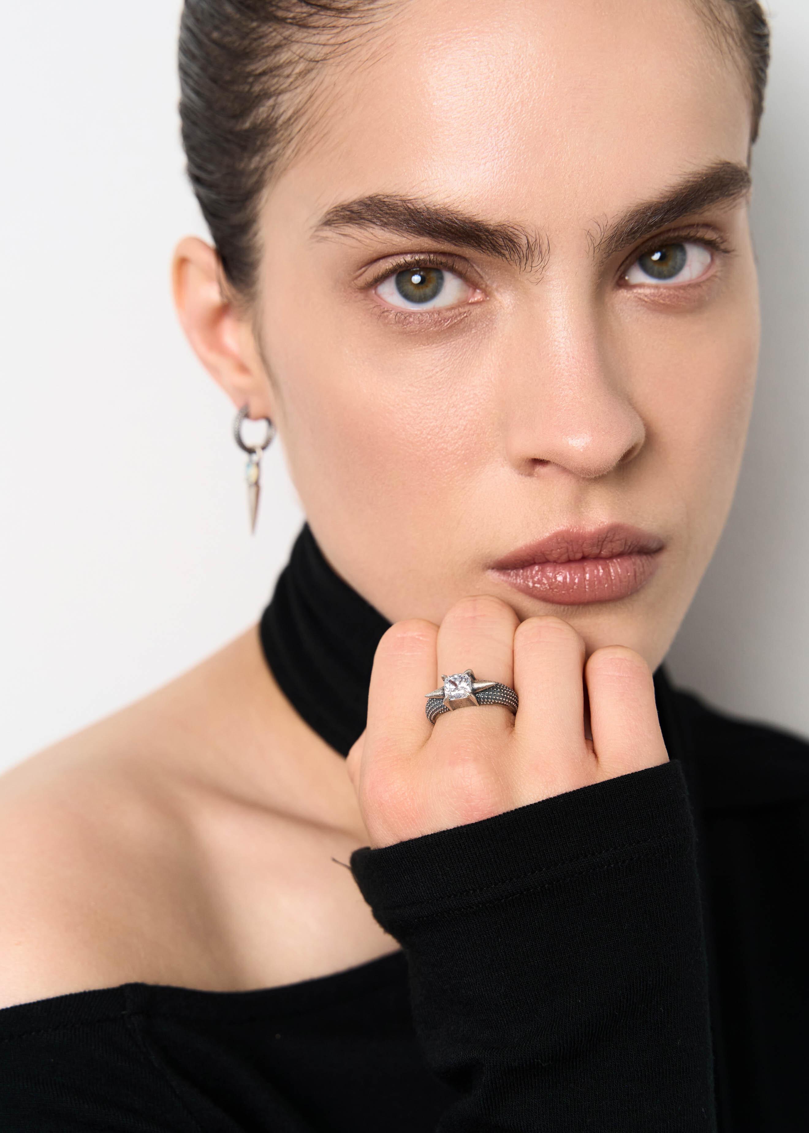 Оригинальное кольцо с сияющим фианитом напоминает шипы или булаву. Это может стать отличной метафорой — смотря, какой смысл вы захотите вложить в это украшение. Довольно смелый, но при этом очень универсальный вариант подарка на 8 марта.