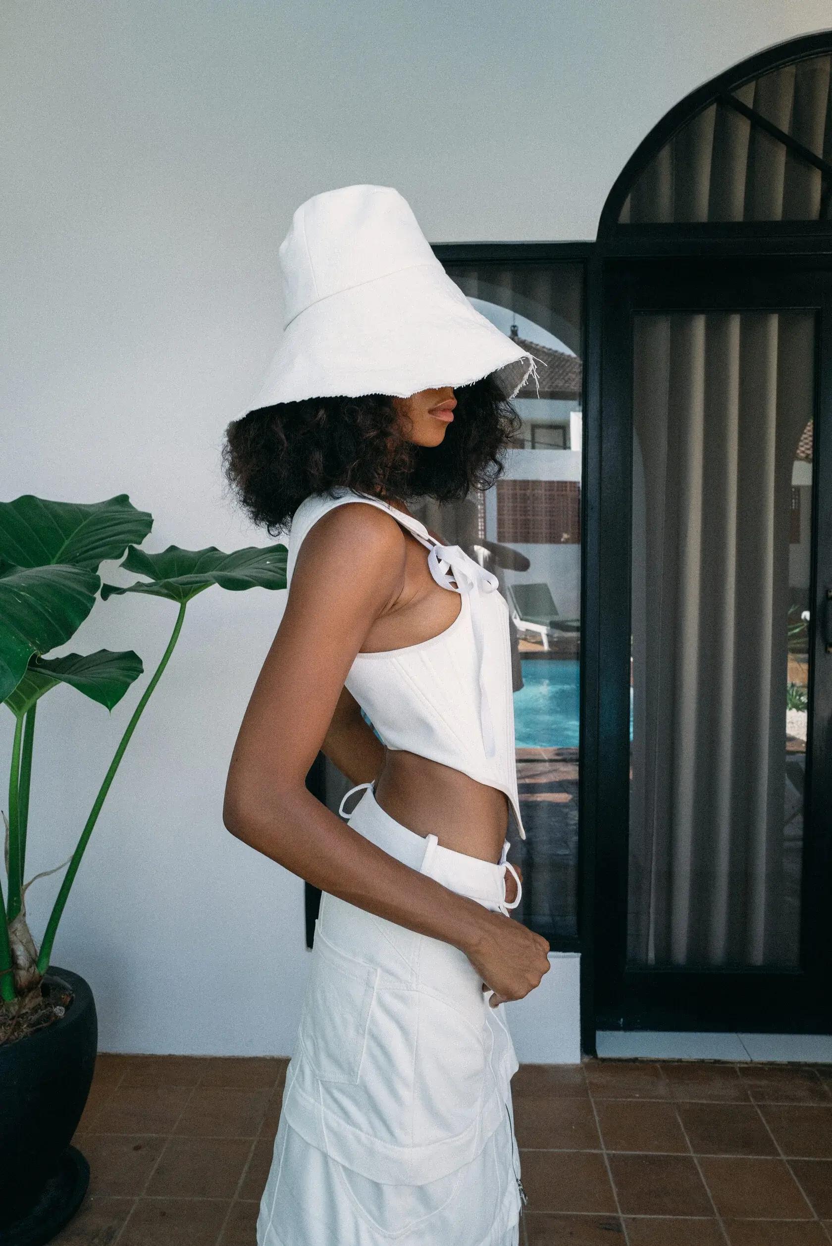 из белого денима с утрированно широкими покатыми полями. Идеальный аксессуар для летнего отдыха.