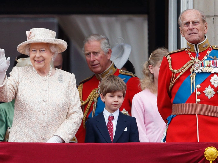 Елизавета II и принц Филипп с Джеймсом, виконтом Северном на балконе Букингемского дворца во время парада в честь Дня рождения Королевы.
