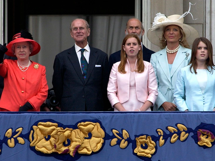 Принц Филипп с Елизаветой II, внучками принцессой Беатрис и принцессой Евгенией, а также с принцем и принцессой Майкл Кентскими на балконе Букингемского дворца. Они приветствуют толпу, празднующую Золотой юбилей правления Королевы.