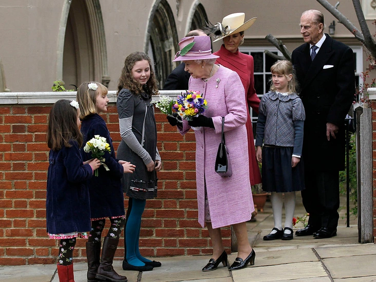 Елизавета II и принц Филипп с 8-летней леди Луизой Виндзор, дочерью принца Эдварда и Софи Уэссекской (на фото рядом с леди Луизой). Они покидают часовню Святого Георгия после посещения пасхальной службы.