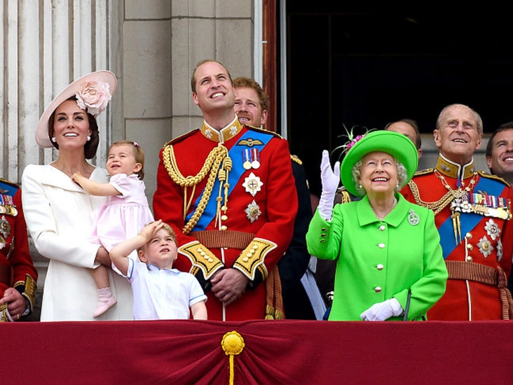 Принц Филипп, Елизавета II, принц Уильям и герцогиня Кэтрин с маленькими правнуками Эдинбургского, принцем Джорджем и принцессой Шарлоттой на балконе Букингемского дворца. Королевская семья празднует 90-летие Королевы.