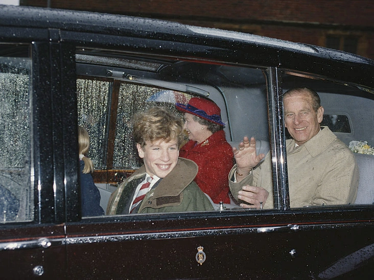 Принц Филипп и подросший Питер Филлипс (здесь ему 14) приветствуют толпу поклонников из окна автомобиля по пути в школу Питера, Port Regis.