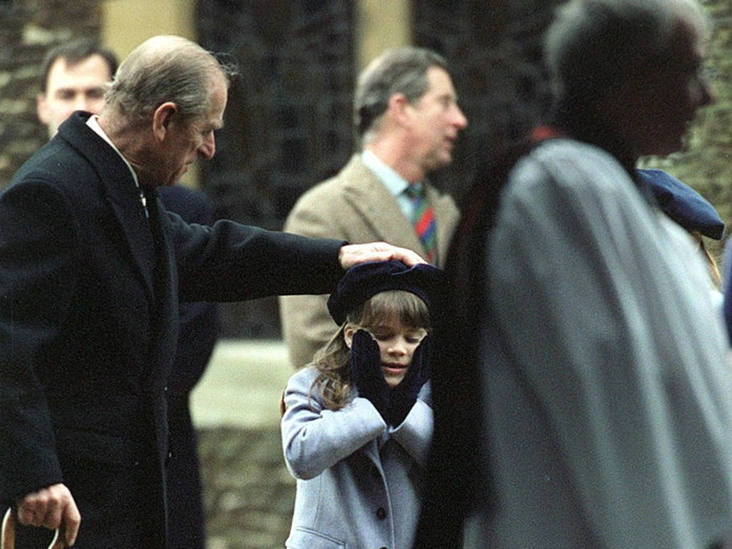 Принц Филипп с восьмилетней принцессой Евгенией, младшей дочерью принца Эндрю и герцогини Сары, по дороге на ежегодную Рождественскую службу в Сандрингеме.