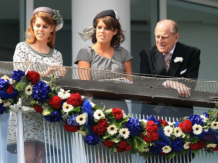 Принц Филипп с принцессами Евгенией и Беатрис на спортивном фестивале в Дерби, первом официальном мероприятии в честь Бриллиантового юбилея правления Елизаветы II.