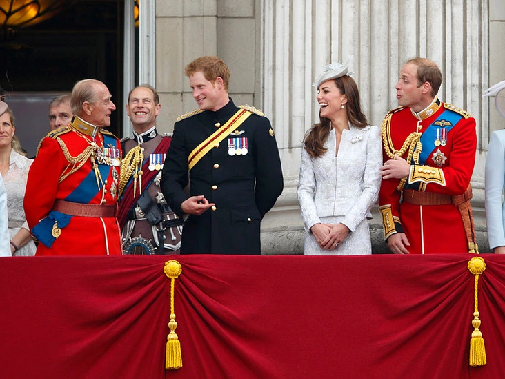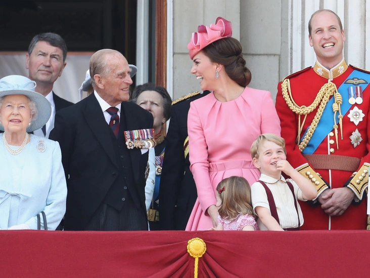 Принц Филипп с принцем Гарри, принцем Уильямом и герцогиней Кэтрин на балконе Букингемского дворца во время парада в честь Дня рождения Королевы.