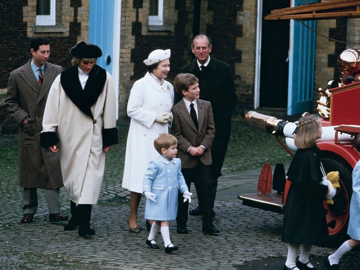 Принц Филипп вместе с Елизаветой II, принцем Чарльзом, принцессой Дианой и внуками, принцами Уильямом и Гарри после визита в музей в Сандрингеме.