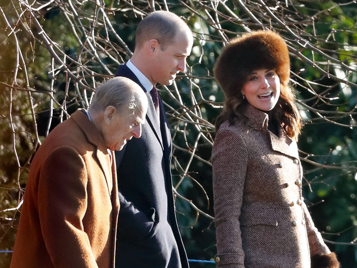Принц Филипп, принц Уильям и герцогиня Кэтрин общаются по дороге на Воскресную службу в Церкви Святой Марии Магдалины в Кингс-Линне.
